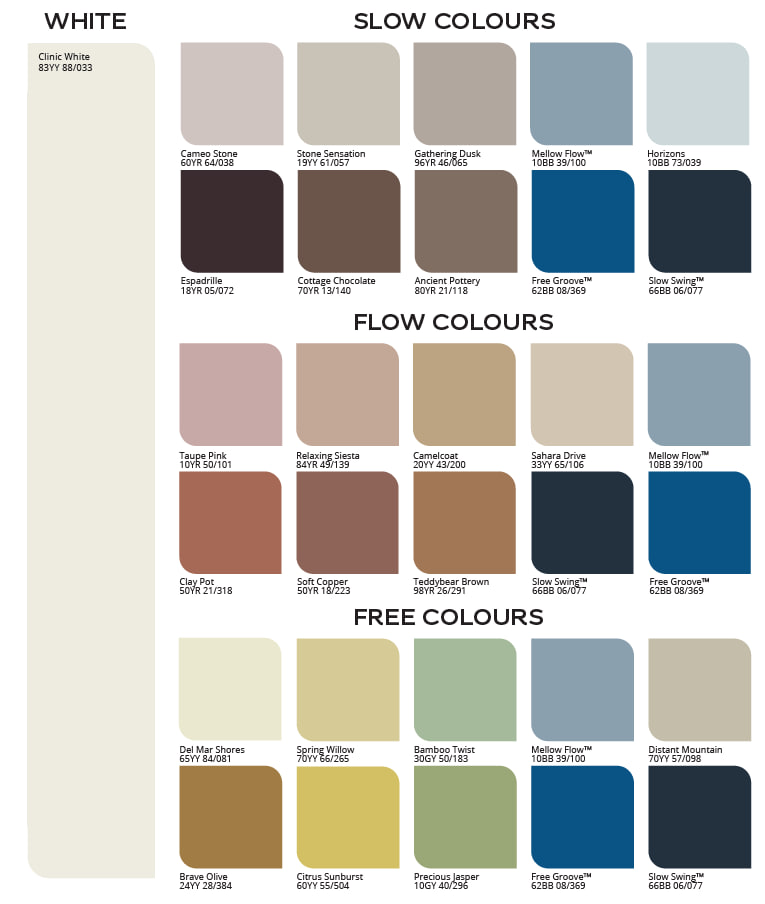 Цветовая история Flow сочетает небесно-голубой Mellow Flow™ с теплыми терракотовыми и природными оттенками. Эта палитра создаёт ощущение уюта, открытости и дружелюбия. Она хорошо подходит для кухонь, гостиных и рабочих пространств, где важны комфорт и живое общение.