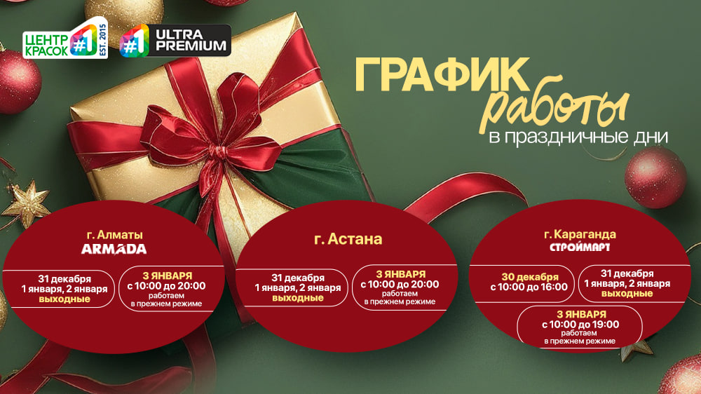 В период новогодних праздников магазины «Центр Красок #1» будут работать по изменённому графику. Просим вас заранее ознакомиться с режимом работы, чтобы удобно спланировать покупки.