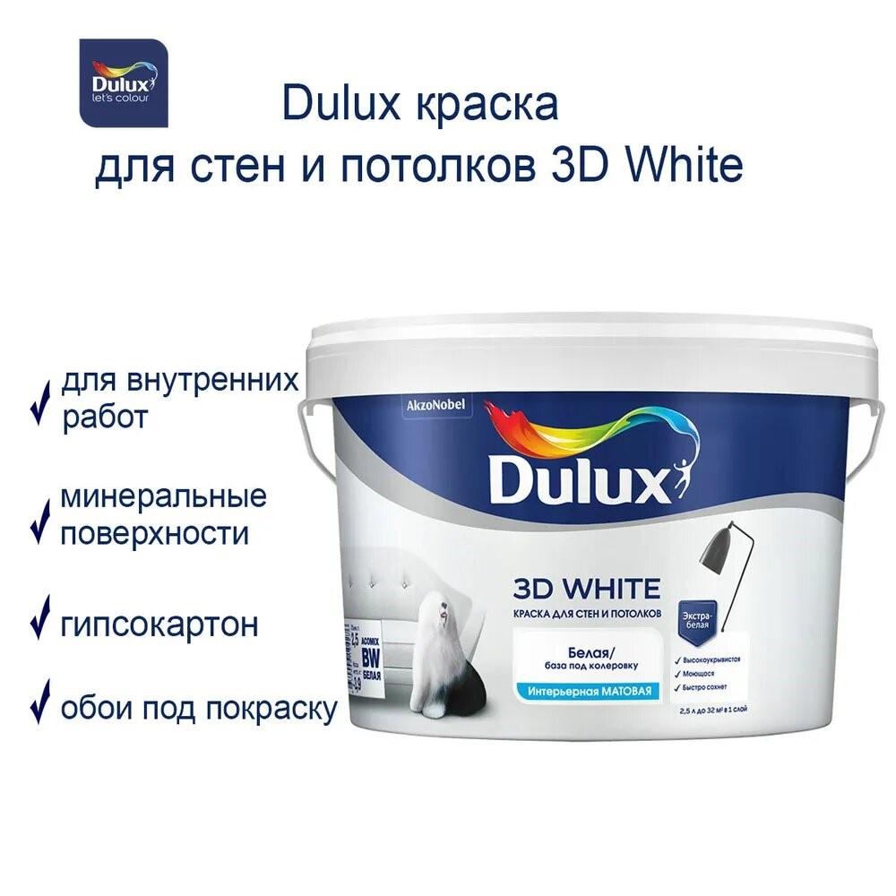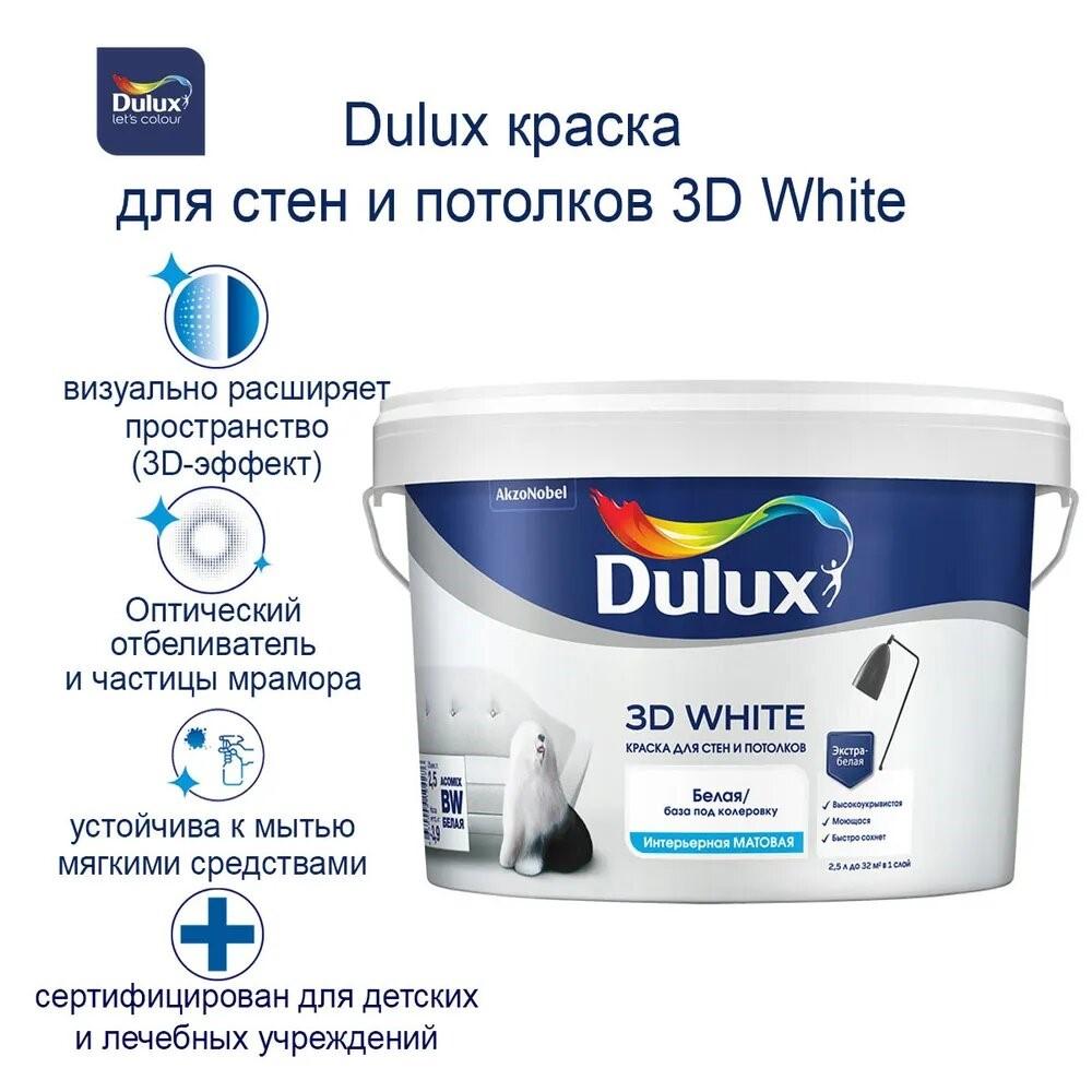 Dulux 3D White — интерьерная акриловая краска с эффектом глубокой белизны и матовым финишем. Создаёт идеально ровное, бархатистое покрытие с высокой укрывистостью и светостойкостью. Благодаря специальной формуле с инновационной технологией 3D White, краска отражает свет, визуально увеличивая пространство и придавая стенам чистый, свежий вид.