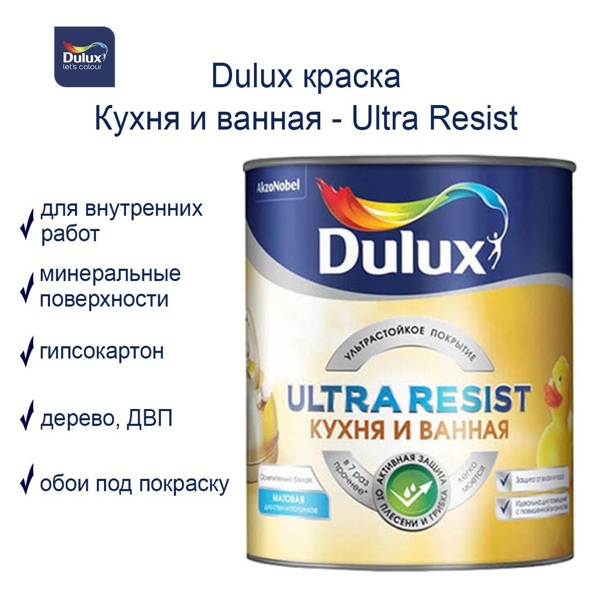 Dulux Ultra Resist "Кухня и ванная" — это влагостойкая интерьерная краска с матовым финишем, специально разработанная для помещений с повышенной влажностью и риском загрязнений. Благодаря технологии Moisture & Stain Repellent, краска эффективно отталкивает воду, жир и бытовые загрязнения, предотвращая появление плесени и разводов. База BC используется для колеровки в насыщенные и тёмные оттенки.